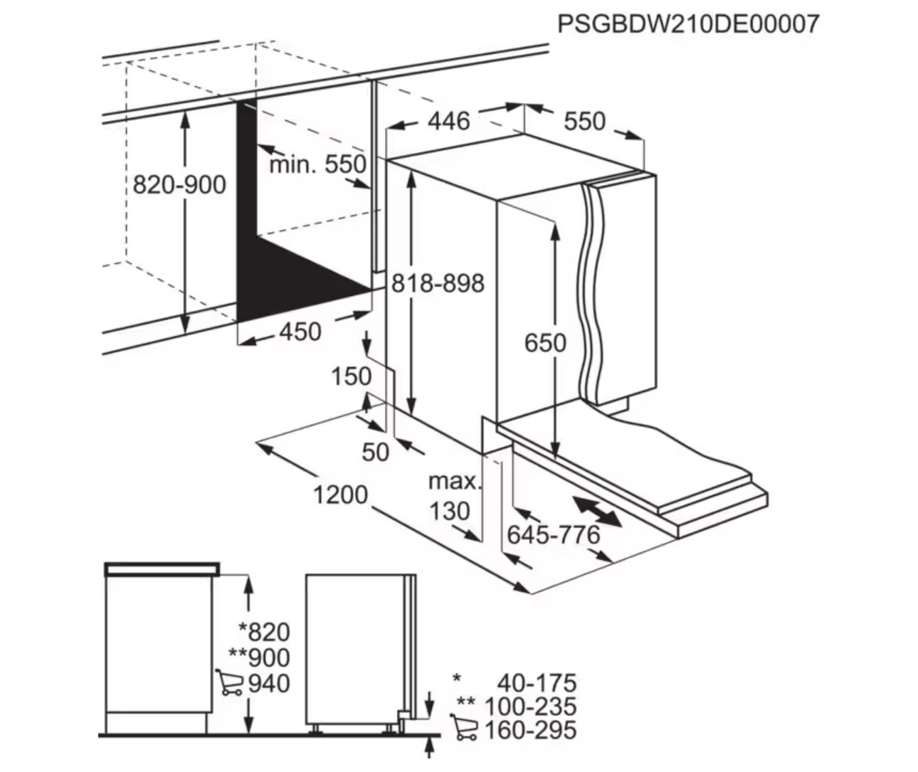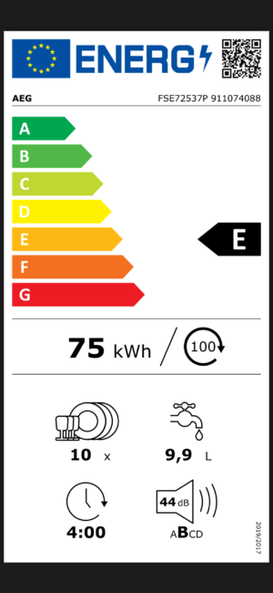 Gamintojas: AEG Montavimo tipas: Įmontuojama(s) Standartizuotas plotis: 45 cm Standartizuotas aukštis: 85 cm NAUJOJI energijos vartojimo efektyvumo klasė: E Valdymas: Jutiklinis su LCD Valdymo panelės vieta: Viduje Energijos suvartojimas 100 ciklų: 75 kWh Vandens suvartojimas 1 ciklui: 9.9 l Garso lygio klasė: B Triukšmo lygis, dB: 44 dB Ciklo trukmė: 240 min. Programa stiklui: Yra Automatinė programa: Yra Laiko trumpinimas: Yra Laiko atidėjimo programa: Yra Automatinis išsijungimas: Yra Karšto vandens prijungimo galimybė: Yra Variklio tipas: Inverterinis Krepšių skaičius: 3 Automatinis durelių atidarymas ciklo pabaigoje: Yra Padidinto efektyvumo purkštukai: Yra Viršutinis purkštukas: Yra Vidaus korpuso medžiaga: Nerūdijantis plienas Vidaus apšvietimas: Yra Slankūs vyriai: Yra Apsauga nuo vandens išsiliejimo: Yra Montavimas aukštyje: Nėra Pakeliamas apatinis krepšys: Nėra Indų komplektų talpa, Vnt: 10 Mažiausias aukštis, cm: 81.8 Didžiausias aukštis, cm: 89.8 Plotis: 44.6 cm Gylis: 55.0 cm Spalva: Balta Prietaiso valdymas programėle: Nėra Temperatūrų skaičius: 4 Programų skaičius: 7 programos Programos eigos projekcija ant grindų: Šviesos signalas ant grindų