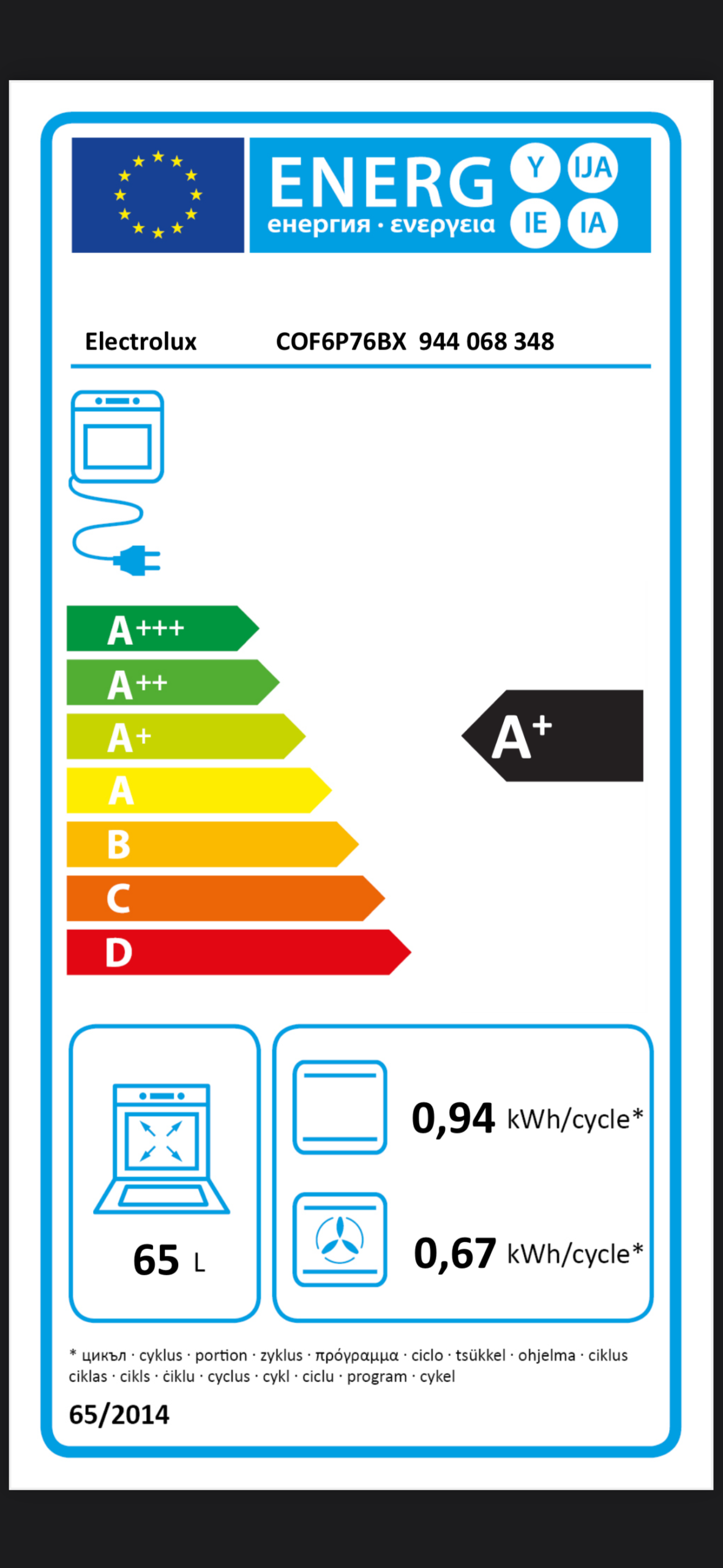 Gamintojas Electrolux Maitinimo tipas Elektrinė Orkaitės tipas Nepriklausoma Orkaitės išsivalymo technologija Pirolizė Garų tipas Nėra Spalva Nerūdijančio plieno / Juoda Valdymas Įspaudžiamos rankenėlės/Sensorinis Valdymo panelė Metalinė / Stiklinė Papildoma informacija Nėra Automatinės kepimo programos Nėra Standartinės kaitinimo funkcijos 9 Mikrobangų funkcija Nėra Teleskopiniai bėgeliai 1 lygio Mėsos termometras Nėra Wi-Fi Nėra Minkštas durelių uždarymas Yra Užraktas nuo vaikų Yra Durelių atsidarymo kryptis Įprastinis Orkaitės durelių stiklų skaičius 4 Greito įkaitinimo funkcija Yra Konvekcija Yra Talpa 65 l Energijos vartojimo efektyvumo klasė A+ Standartizuotas aukštis 60 cm Standartizuotas plotis 60 cm Aukštis 58.9 cm Plotis 59.4 cm Gylis 56.1 cm